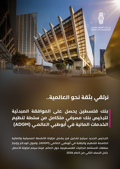 أعلن بنك فلسطين عن نيله الموافقة المبدئية من سلطة تنظيم الخدمات المالية في سوق أبوظبي العالمي (ADGM)، المركز المالي الدولي للعاصمة الإماراتية، أبوظبي، للحصول على ترخيص الفئة الأولى (Category 1 – CAT1)، مما يتيح له تشغيل فرع مصرفي متكامل الخدمات في سوق أبوظبي العالمي (ADGM)، بما يشمل مزاولة الأنشطة المصرفية والمالية الخاضعة للتنظيم والرقابة في سوق أبوظبي العالمي (ADGM)، وعلى وجه الخصوص قبول الودائع وإنجاز صفقات الاستثمار، مستهدفاً مجتمع الجاليات الفلسطينية في جميع أنحاء العالم.